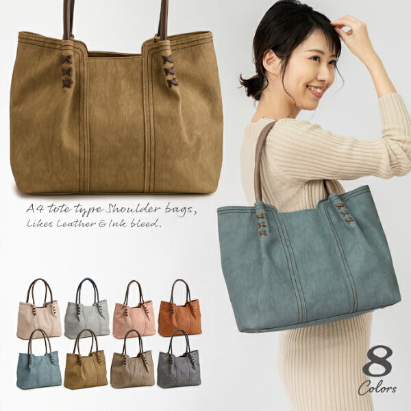 ●グレー (緑がかったグレー×ネイビー) ●ブルー (ブルーグレー×オーク) ●ブラウン(オレンジブラウン×チョコ) ●ピンク (くすみ茶系ピンク×チョコ) ●オーク (こげ茶×チョコ) ●ブラック(灰ブラック×ブラック) ■ 本体 : H 約27cm × 底幅 約33cm × D 約13cm ■ ハンドルの長さ:約46cm ■ MATERIAL :合成皮革 ■ WEIGHT : 約590g <商品名>A4 レースアップ クロスステッチ トートバッグ くすみカラー PUレザートート